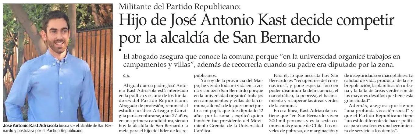 José antonio kast adriásola será parte de la obra miss saigón, una adaptación de madame butterfly. El líder del partido republicano se encuentra con oxígeno. Partido de josé antonio kast se declara en oposición al gobierno de piñera. Sobre las causas que llevaron a la internación de josé antonio kast, el escrito expuso que luego de varios exámenes, el médico tratante ha indicado su hospitalización y el tratamiento con medicamentos y oxígeno. En las elecciones presidenciales del próximo domingo en chile, el abogado josé antonio kast (santiago, 1966) pretende convocar al electorado que se identifica con las posiciones de la derecha más dura y conservadora.